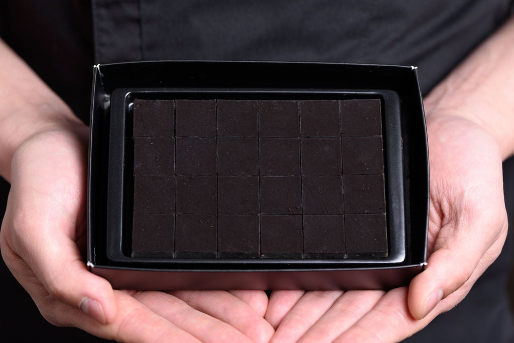 Each box contains twenty-four individual pieces of our nutty "Black Sesame & White Chocolate Nama Choco."